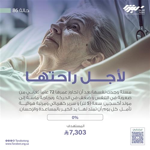 مسنة وجدت نفسها بعد أن تجاوز عمرها 72 عاماً تعاني من صعوبة في التنفس و ضعف في الحركة وبحاجة ماسة إلى مولد أكسجين سعة (5 لتر) و سرير كهربائي ومرتبة هوائية ، تأمل كل يوم أن تمتد لها يد الخير بالمساعدة والإحسان.