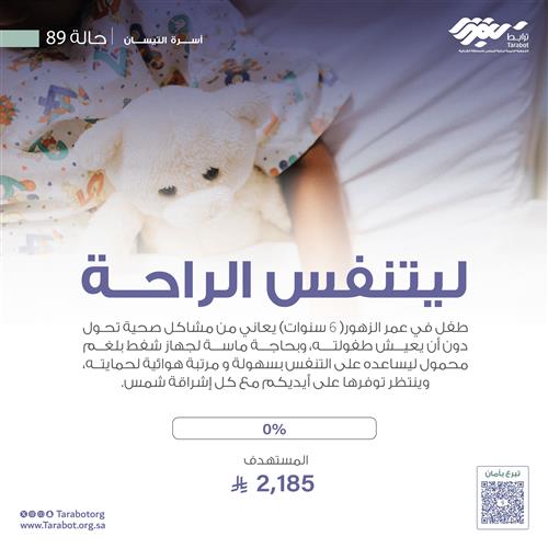 طفل في عمر الزهور( 6 سنوات) يعاني من مشاكل صحية تحول دون أن يعيش طفولته، وبحاج ماسة لجهاز شفط بلغم محمول بتكلفة ( 2,185 ريالا ) ليساعده على التنفس بسهولة و مرتبة هوائية لحمايته، وينتظر توفرها على أيديكم مع كل إشراقة شمس.