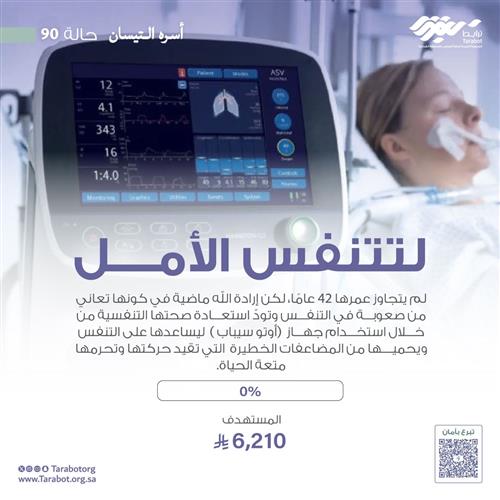 لم يتجاوز عمرها ٤٢ عامًا، لكن إرادة الله ماضية في كونها تعاني من صعوبة في التنفس وتودّ استعادة صحتها التنفسية من خلال استخدام جهاز (أوتو سيباب ) بتكلفة ( 6210 ريالاً) ليساعدها على التنفس ويحميها من المضاعفات الخطيرة التي تقيد حركتها وتحرمها متعة الحياة.