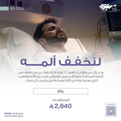 ما يزال في مقتبل العمر 32 عامًا، إلا إنه يعاني من ضعف في الحركة وبحاجة ماسة إلى سرير كهربائي ، بتكلفة ( 2,640 ريال ) للحد من الألم والتعب الذي يعتريه، وله في الله ثم بكم أمل يتجدد كل صباح.
