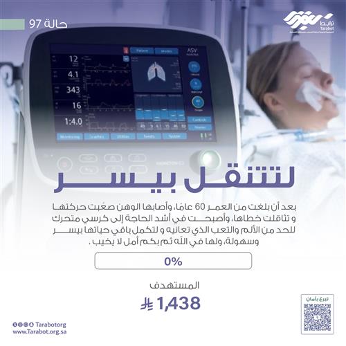 بعد أن بلغت من العمر 60 عامًا، وأصابها الوهن صعُبت حركاتها و تثاقلت خطاها، وأصبحت في أشد الحاجة إلى كرسي متحرك ، بتكلفة ( 1438 ريالا ) ، للحد من الألم والتعب الذي تعانيه و لتكمل باقي حياتها بيسر وسهولة، وله في الله ثم بكم أمل لا يخيب .