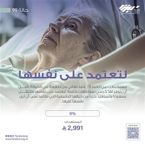 مسنه بلغت من العمر 70 عامًا، تعاني من صعوبة في الحركة تأمل أن يتوفر لها كرسي بمواصفات خاصة بتكلفة (2,991 ريالا) لتعتمد على نفسها وتتنقل بسهولة وتستعيد جزءًا من حياتها الطبيعية التي طالما تمنى أن ترى نفسها عليها.
