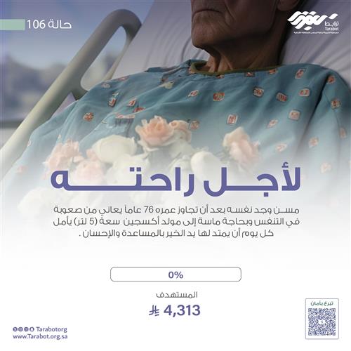 مسن وجد نفسه بعد أن تجاوز عمره 76 عاماً يعاني من صعوبة في التنفس وبحاجة ماسة إلى مولد أكسجين سعة (5 لتر) بتكلفه (4313 ريالا )، يأمل كل يوم أن يمتد لها يد الخير بالمساعدة والإحسان .